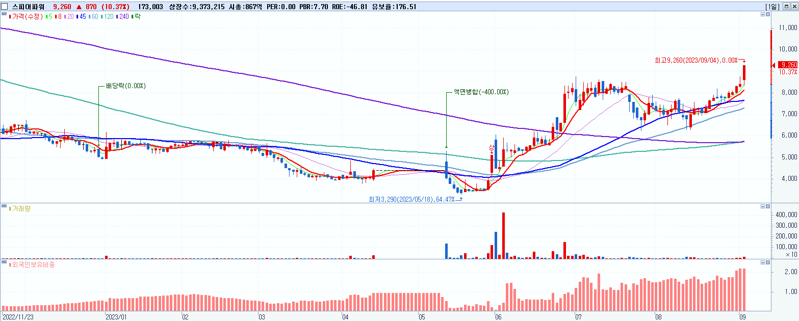 - 스피어파워 (9,260원 ▲ 10.37% , 시총: 868억, 거래량: 173,003, 거래대금:15억)