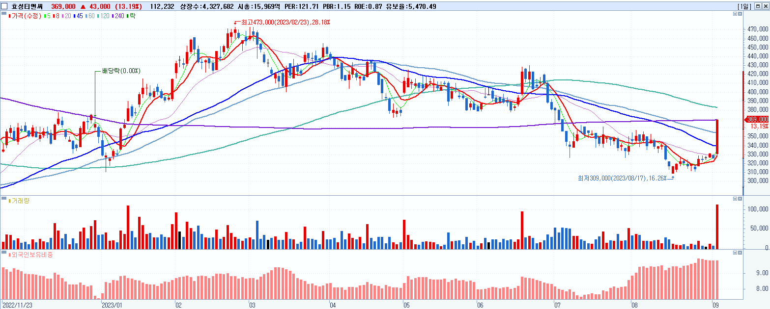 - 효성티앤씨 (369,000원 ▲ 13.19% , 시총: 15,969억, 거래량: 112,232, 거래대금:401억)