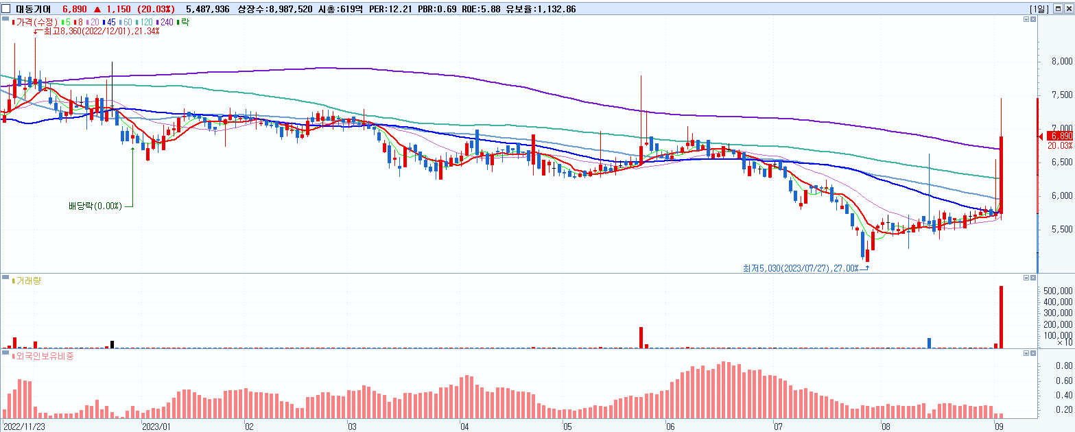 - 대동기어 (6,890원 ▲ 20.03% , 시총: 619억, 거래량: 5,487,936, 거래대금:380억)