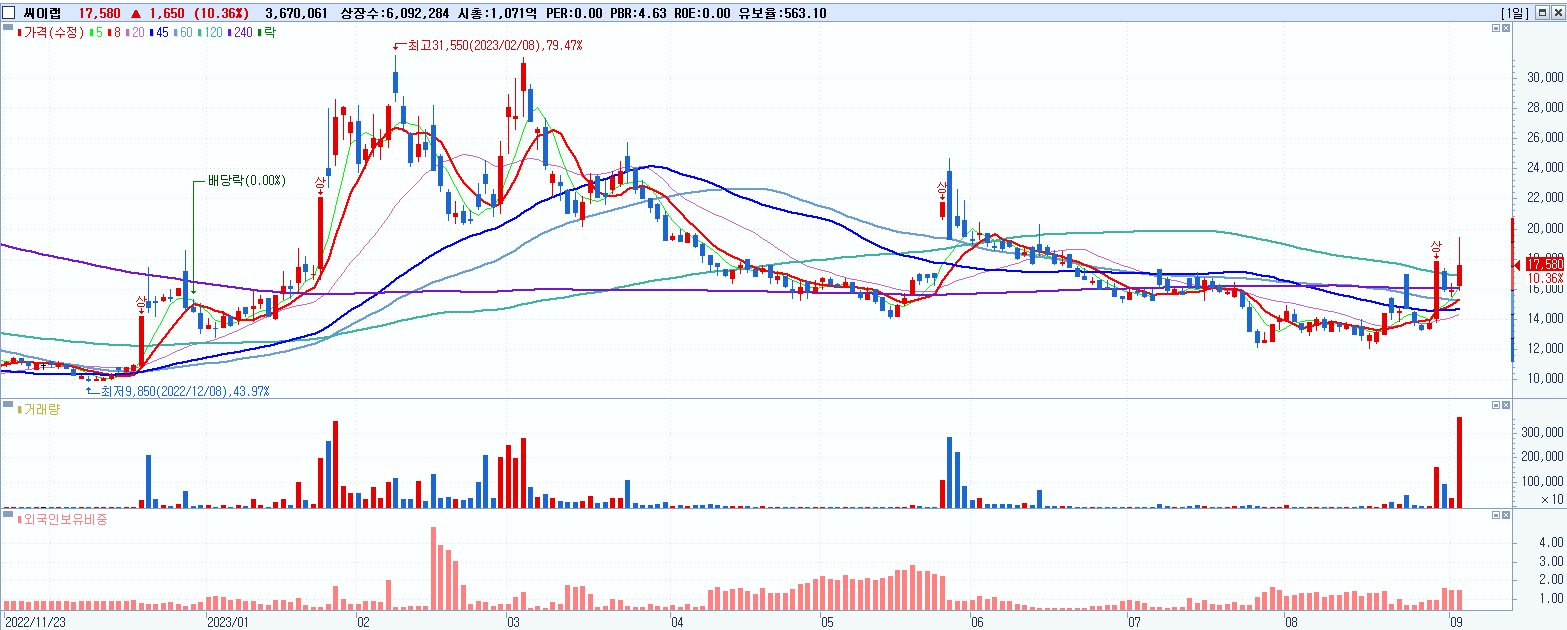 - 씨이랩 (17,580원 ▲ 10.36% , 시총: 1,071억, 거래량: 3,670,061, 거래대금:668억)
