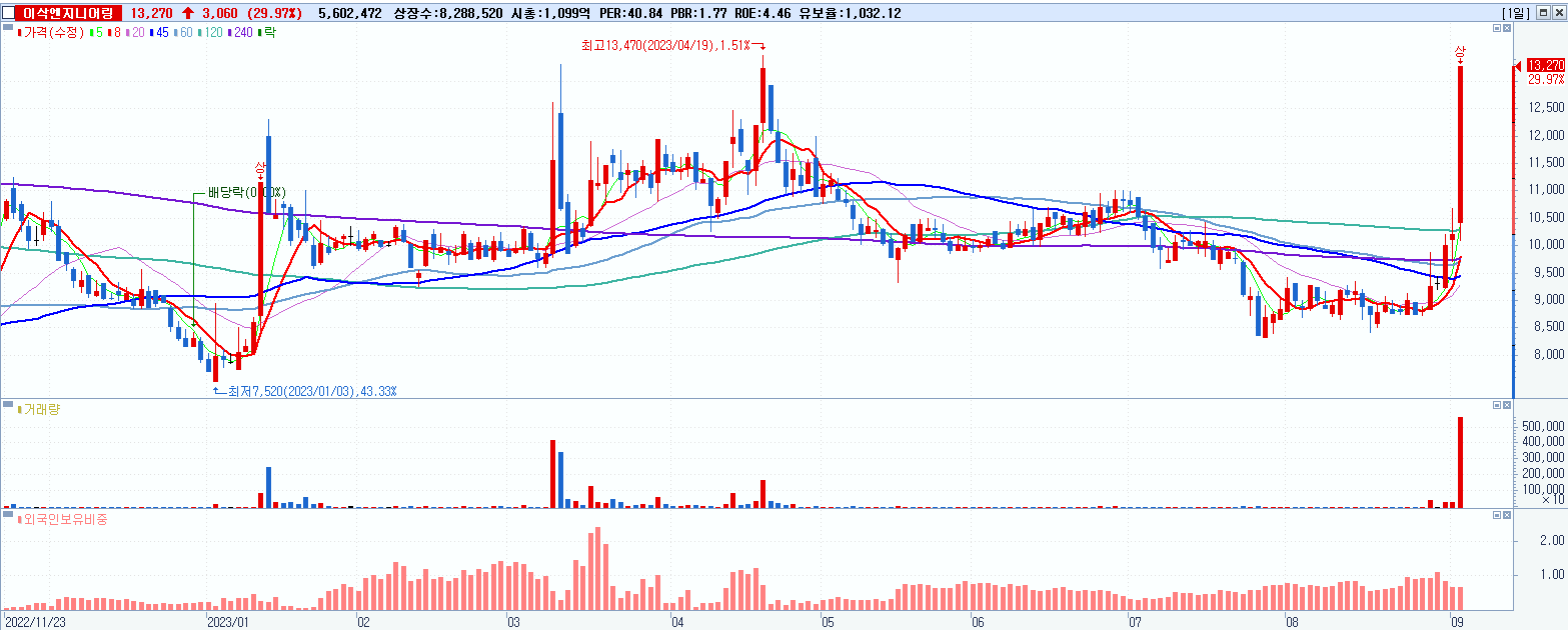 - 이삭엔지니어링 (13,270원 ▲ 29.97% , 시총: 1,100억, 거래량: 5,602,472, 거래대금:692억)