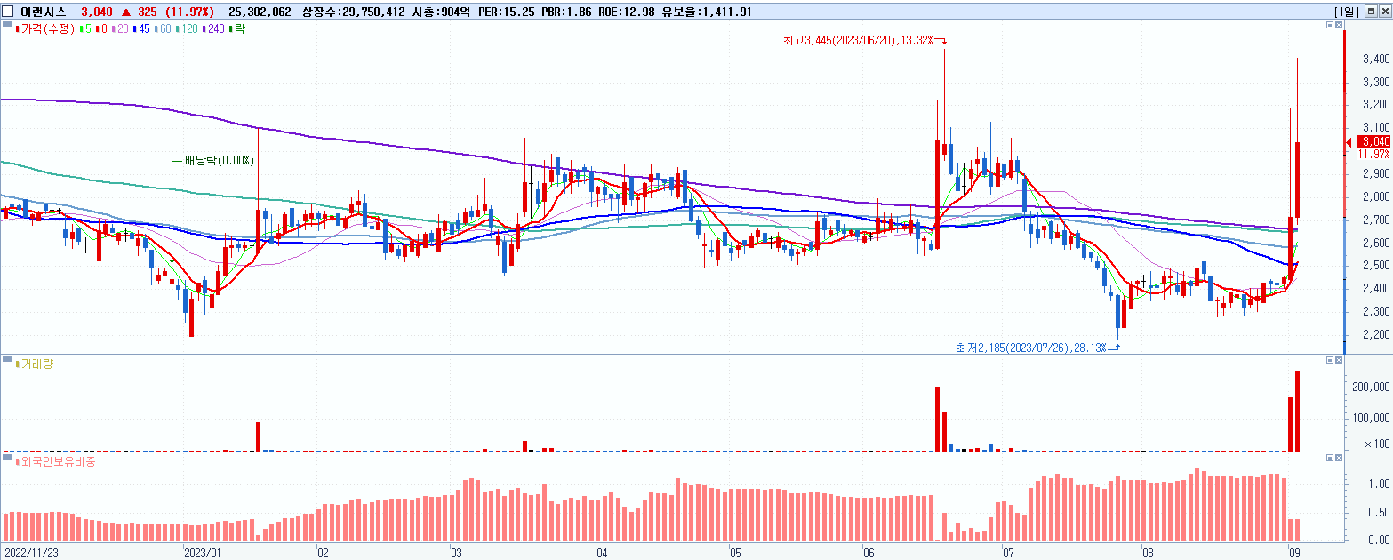 - 이랜시스 (3,040원 ▲ 11.97% , 시총: 904억, 거래량: 25,302,062, 거래대금:793억)