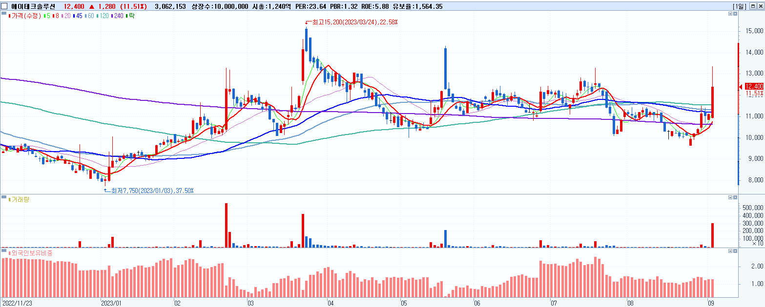 - 에이테크솔루션 (12,400원 ▲ 11.51% , 시총: 1,240억, 거래량: 3,062,153, 거래대금:388억)