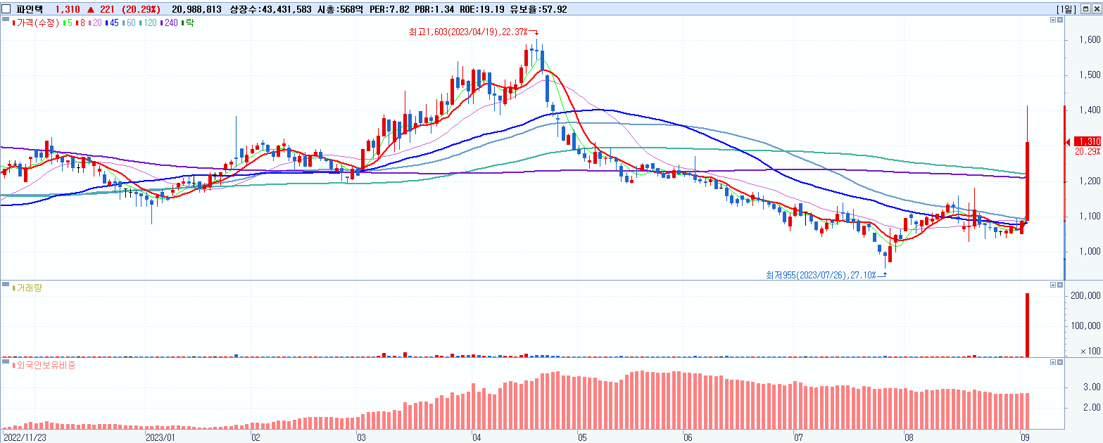 - 파인텍 (1,310원 ▲ 20.29% , 시총: 569억, 거래량: 20,988,813, 거래대금:274억)