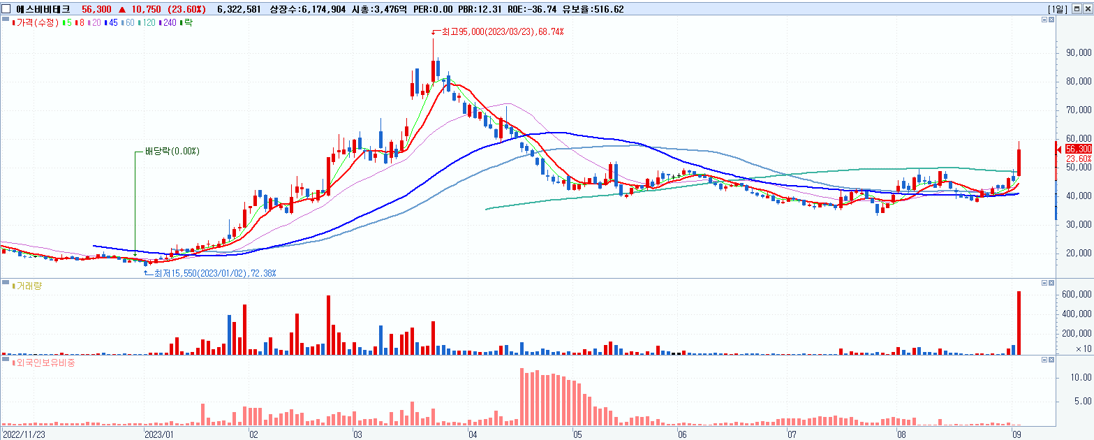 - 에스비비테크 (56,300원 ▲ 23.6% , 시총: 3,476억, 거래량: 6,322,581, 거래대금:3,570억)