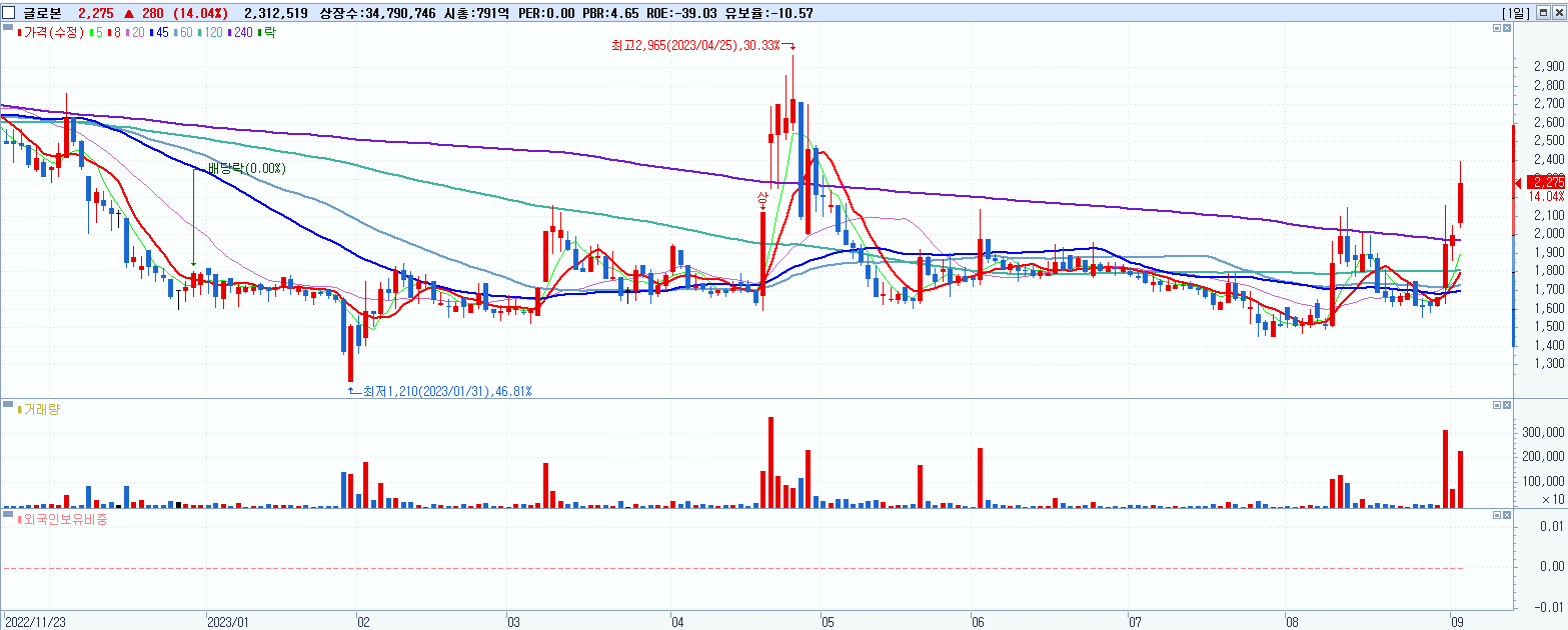 - 글로본 (2,275원 ▲ 14.04% , 시총: 791억, 거래량: 2,312,519, 거래대금:51억)