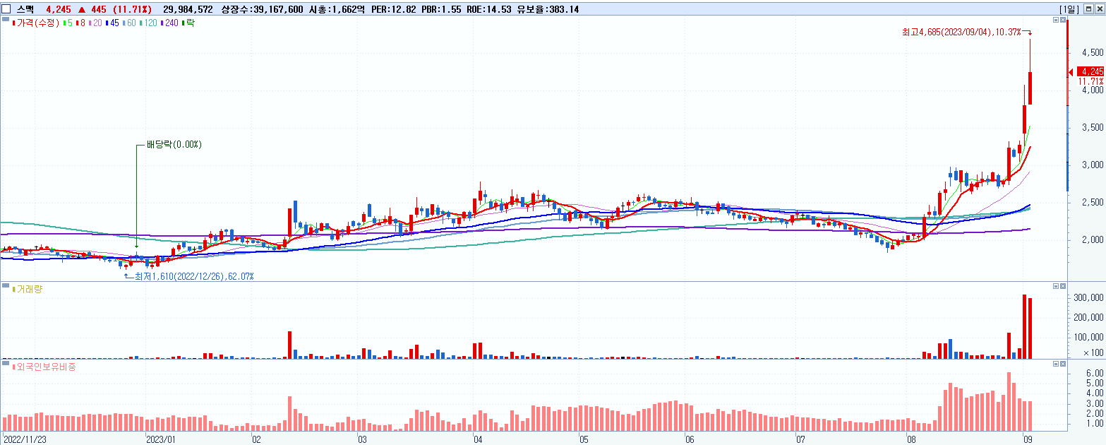 - 스맥 (4,245원 ▲ 11.71% , 시총: 1,663억, 거래량: 29,984,572, 거래대금:1,289억)
