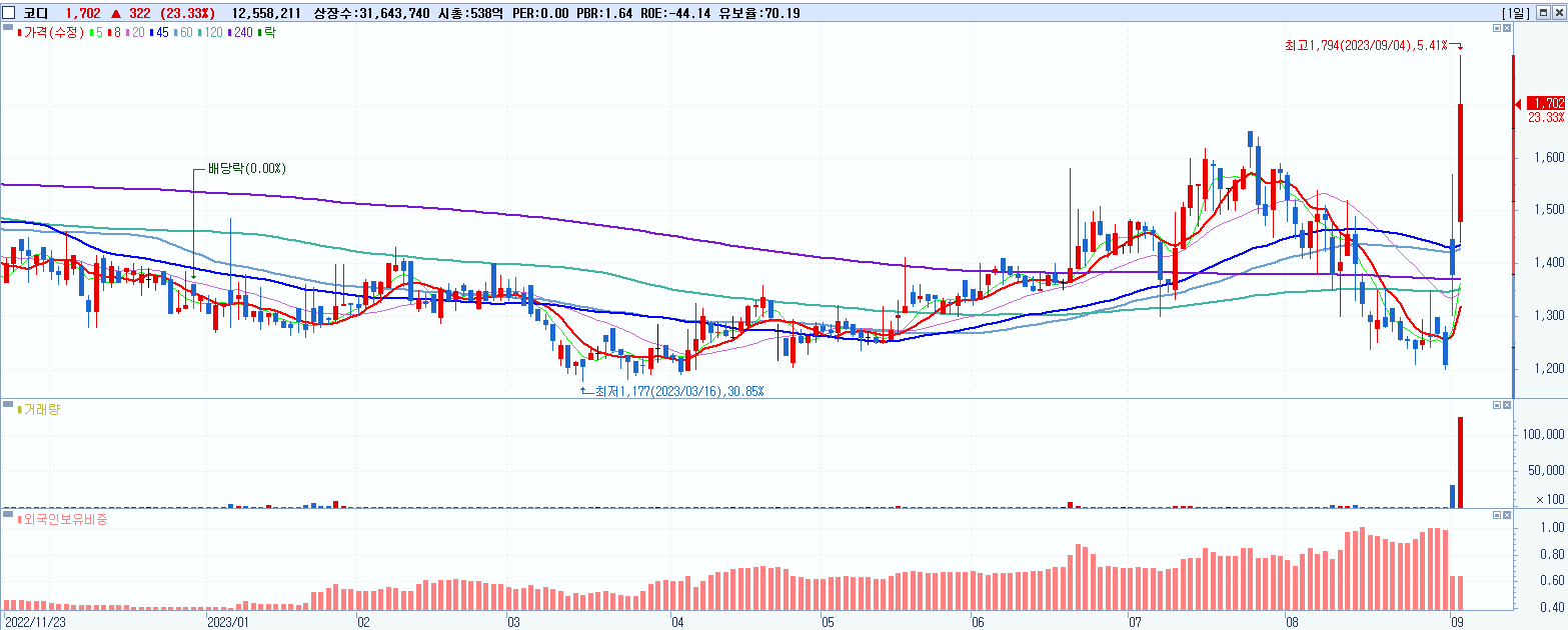 - 코디 (1,702원 ▲ 23.33% , 시총: 539억, 거래량: 12,558,211, 거래대금:217억)