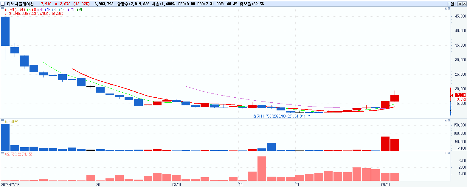 - 이노시뮬레이션 (17,910원 ▲ 13.07% , 시총: 1,401억, 거래량: 6,903,793, 거래대금:1,244억)