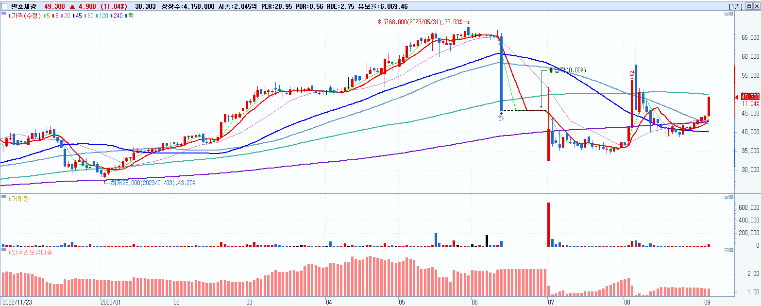 - 만호제강 (49,300원 ▲ 11.04% , 시총: 2,046억, 거래량: 38,303, 거래대금:18억)