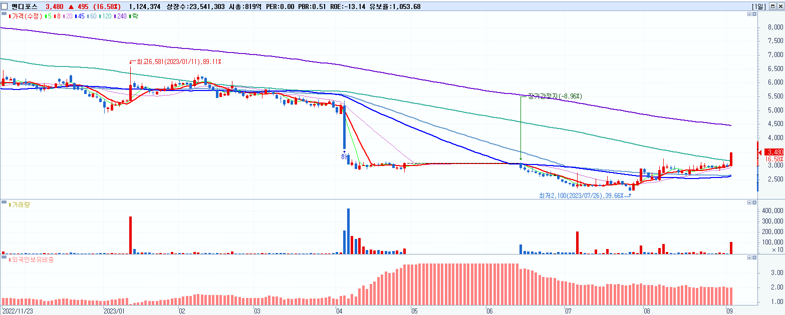 - 앤디포스 (3,480원 ▲ 16.58% , 시총: 819억, 거래량: 1,124,374, 거래대금:37억)