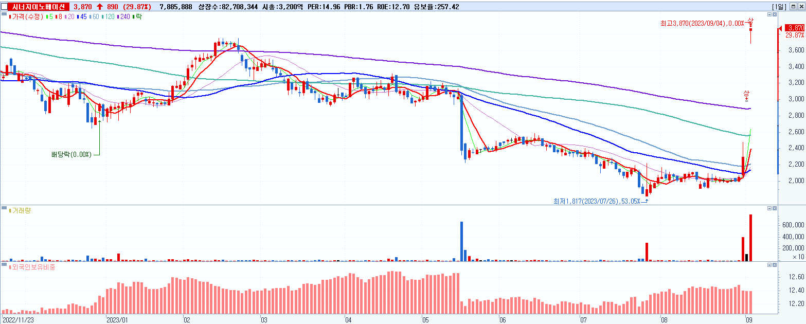 3.시너지이노베이션 3,870원 ▲ 29.87% (KOSDAQ, 048870)