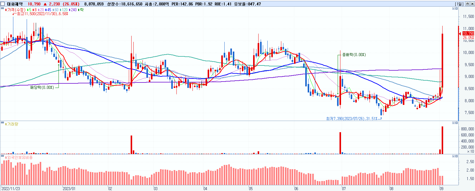 - 대화제약 (10,790원 ▲ 26.05% , 시총: 2,009억, 거래량: 8,878,059, 거래대금:918억)
