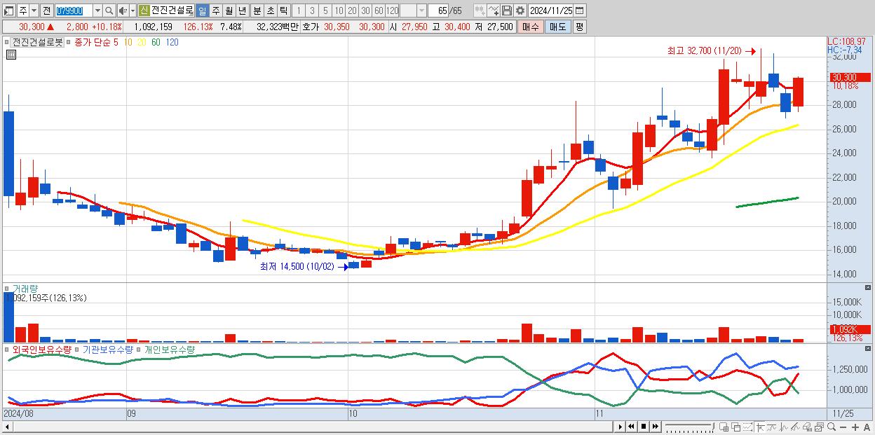 - 전진건설로봇 (30,300원 ▲ 10.18% , 시총: 4,422억, 외국인 순매수 거래금:49억)