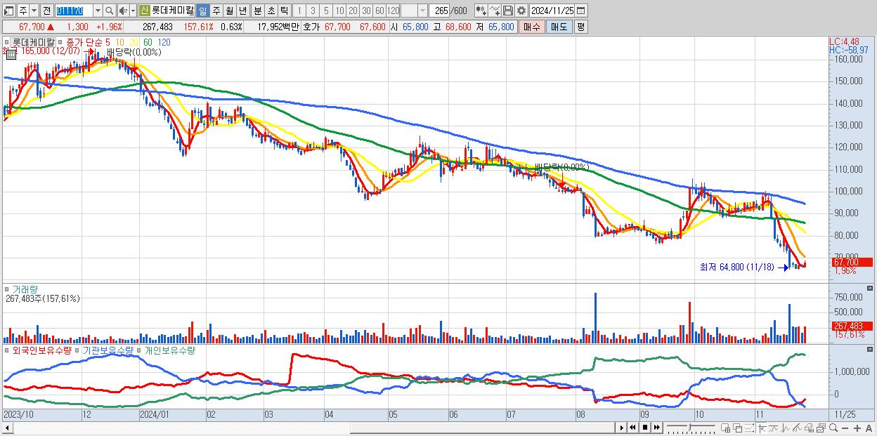 - 롯데케미칼 (67,700원 ▲ 1.96% , 시총: 28,959억, 외국인 순매수 거래금:54억)