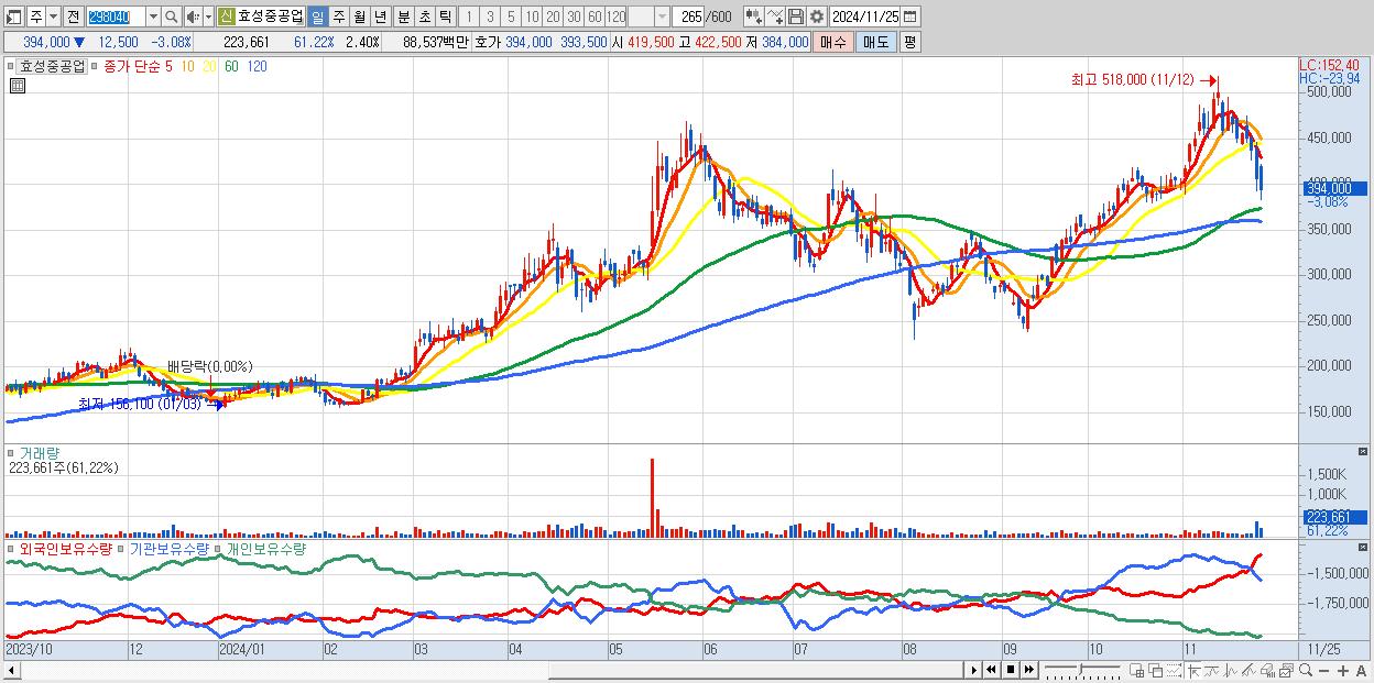 - 효성중공업 (394,000원 ▼ -3.08% , 시총: 36,739억, 외국인 순매수 거래금:60억)