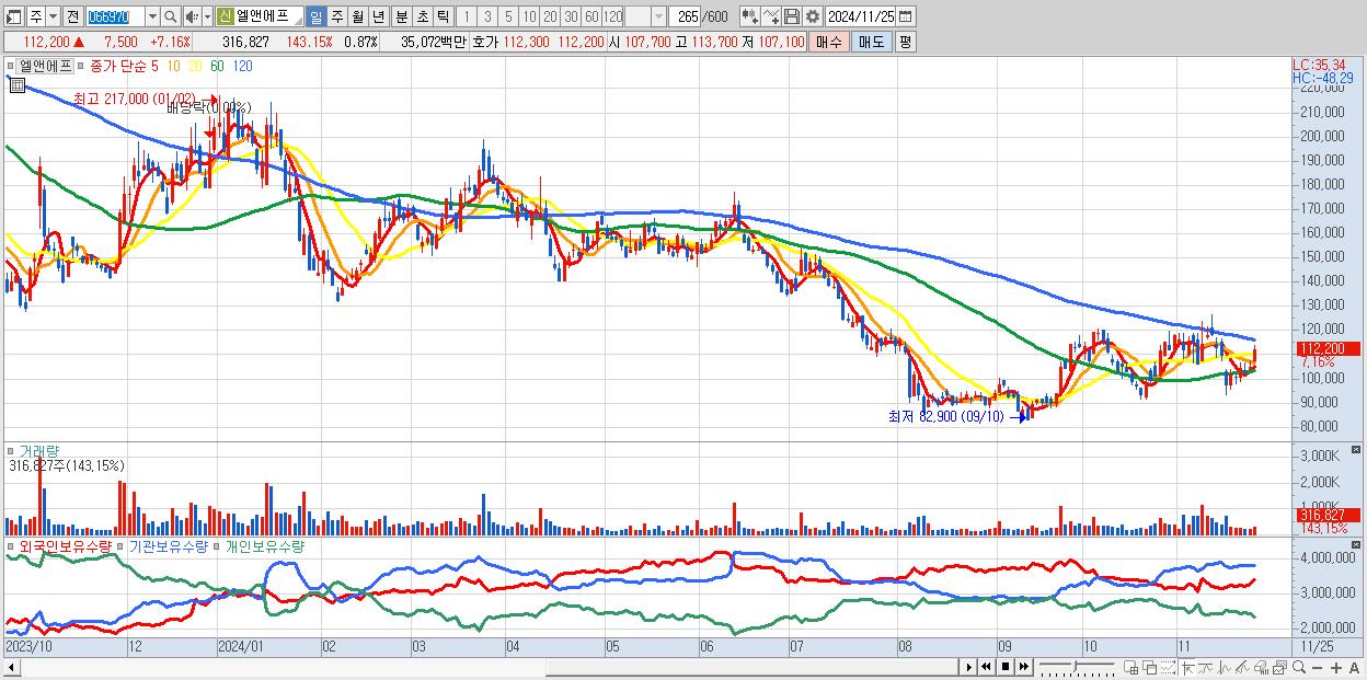 - 엘앤에프 (112,200원 ▲ 7.16% , 시총: 40,724억, 외국인 순매수 거래금:102억)
