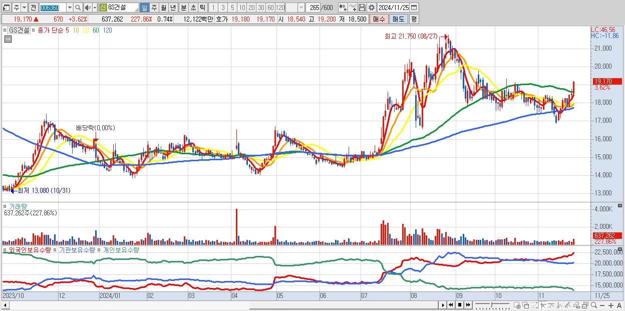 - GS건설 (19,170원 ▲ 3.62% , 시총: 16,406억, 외국인 순매수 거래금:60억)