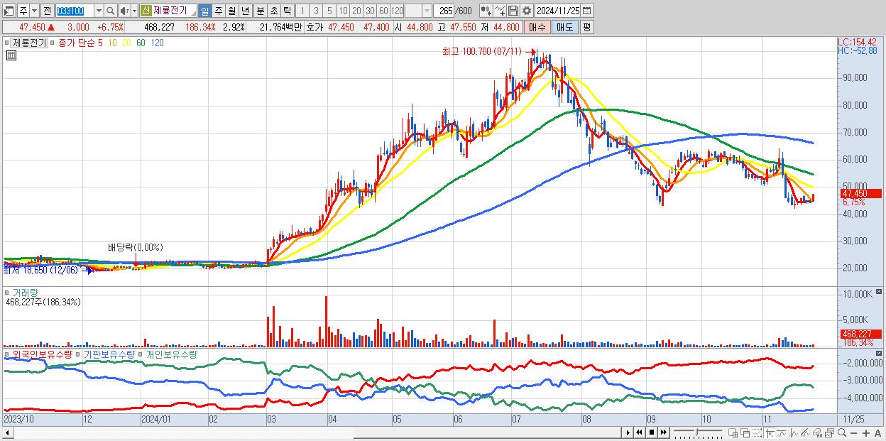- 제룡전기 (47,450원 ▲ 6.75% , 시총: 7,622억, 외국인 순매수 거래금:49억)