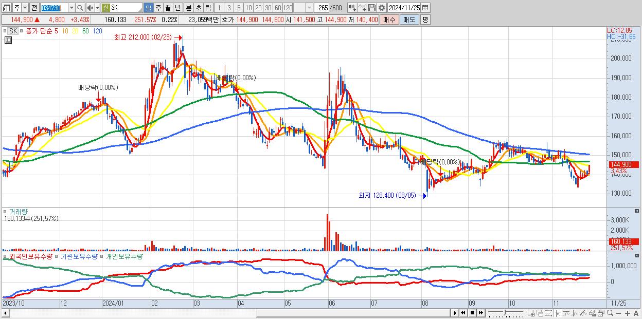 - SK (144,900원 ▲ 3.43% , 시총: 105,056억, 외국인 순매수 거래금:48억)