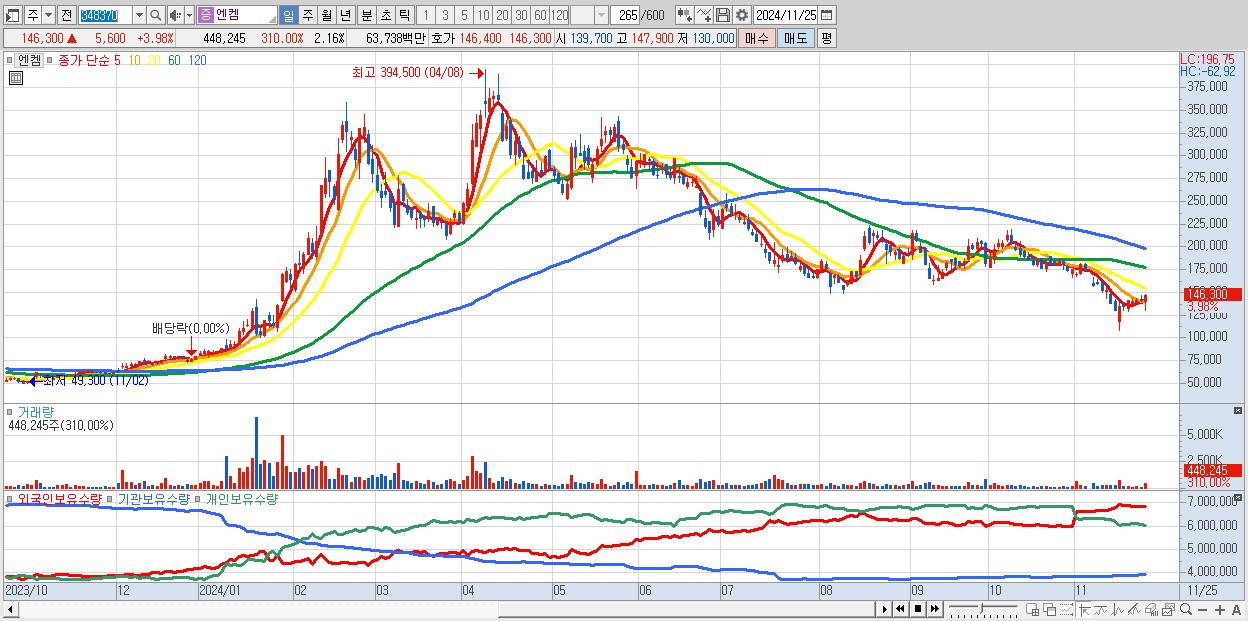 - 엔켐 (146,300원 ▲ 3.98% , 시총: 30,411억, 외국인 순매수 거래금:44억)