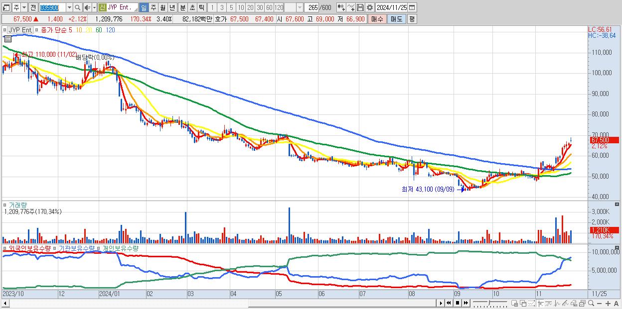 - JYP Ent. (67,500원 ▲ 2.12% , 시총: 23,984억, 외국인 순매수 거래금:59억)