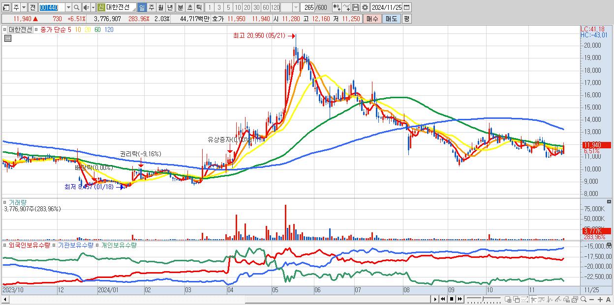 - 대한전선 (11,940원 ▲ 6.51% , 시총: 22,262억, 외국인 순매수 거래금:55억)