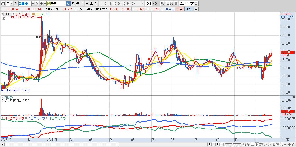 - HMM (18,880원 ▲ 1.56% , 시총: 166,340억, 외국인 순매수 거래금:84억)