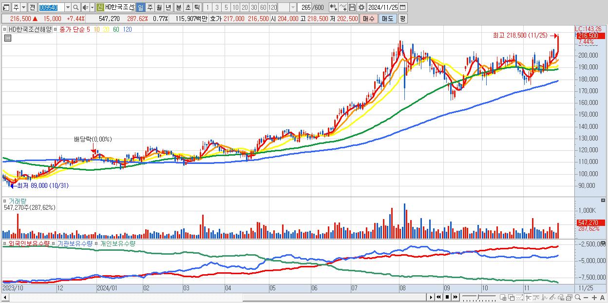 - HD한국조선해양 (216,500원 ▲ 7.44% , 시총: 153,224억, 외국인 순매수 거래금:306억)