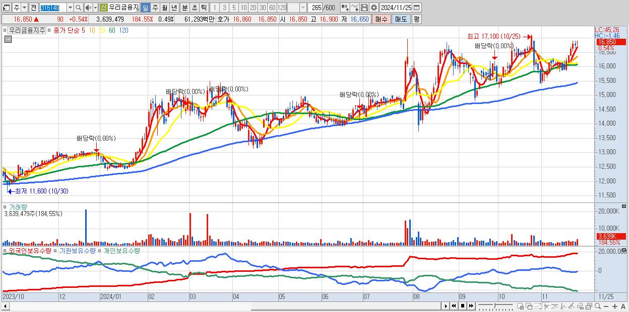 - 우리금융지주 (16,850원 ▲ 0.54% , 시총: 125,127억, 외국인 순매수 거래금:92억)