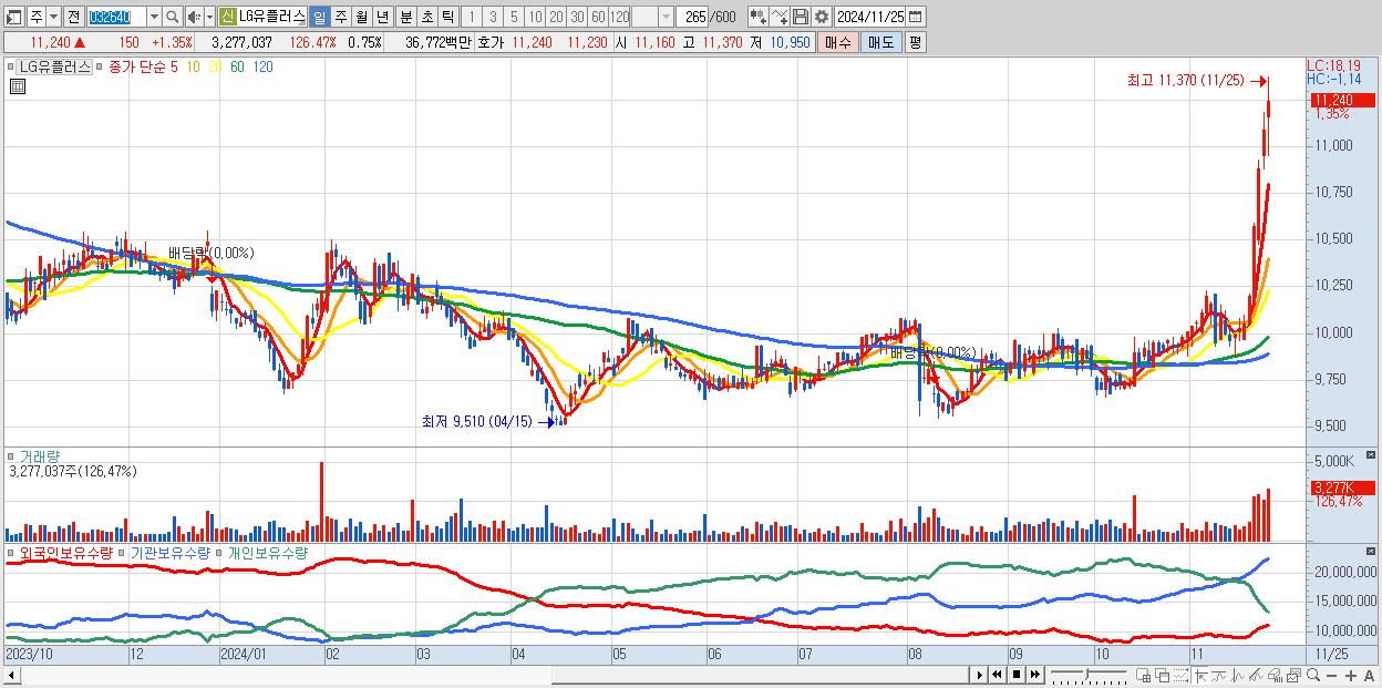 - LG유플러스 (11,240원 ▲ 1.35% , 시총: 49,075억, 거래량: 3,277,037, 거래대금:368억, KOSPI)