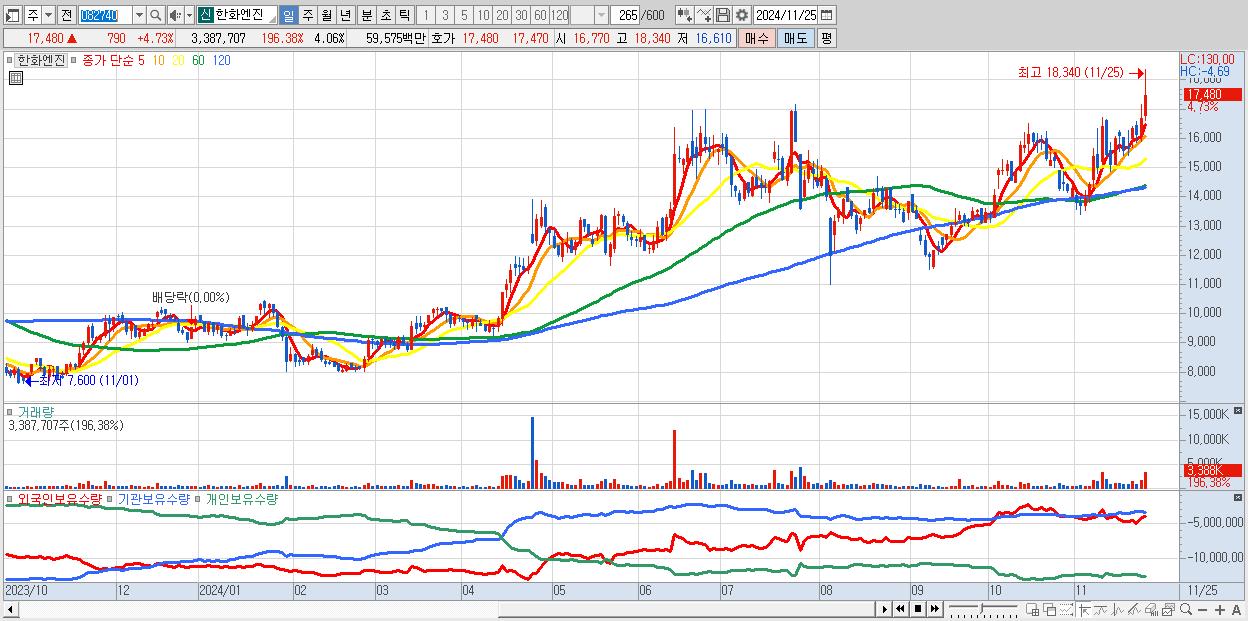 - 한화엔진 (17,480원 ▲ 4.73% , 시총: 14,587억, 거래량: 3,387,707, 거래대금:596억, KOSPI)