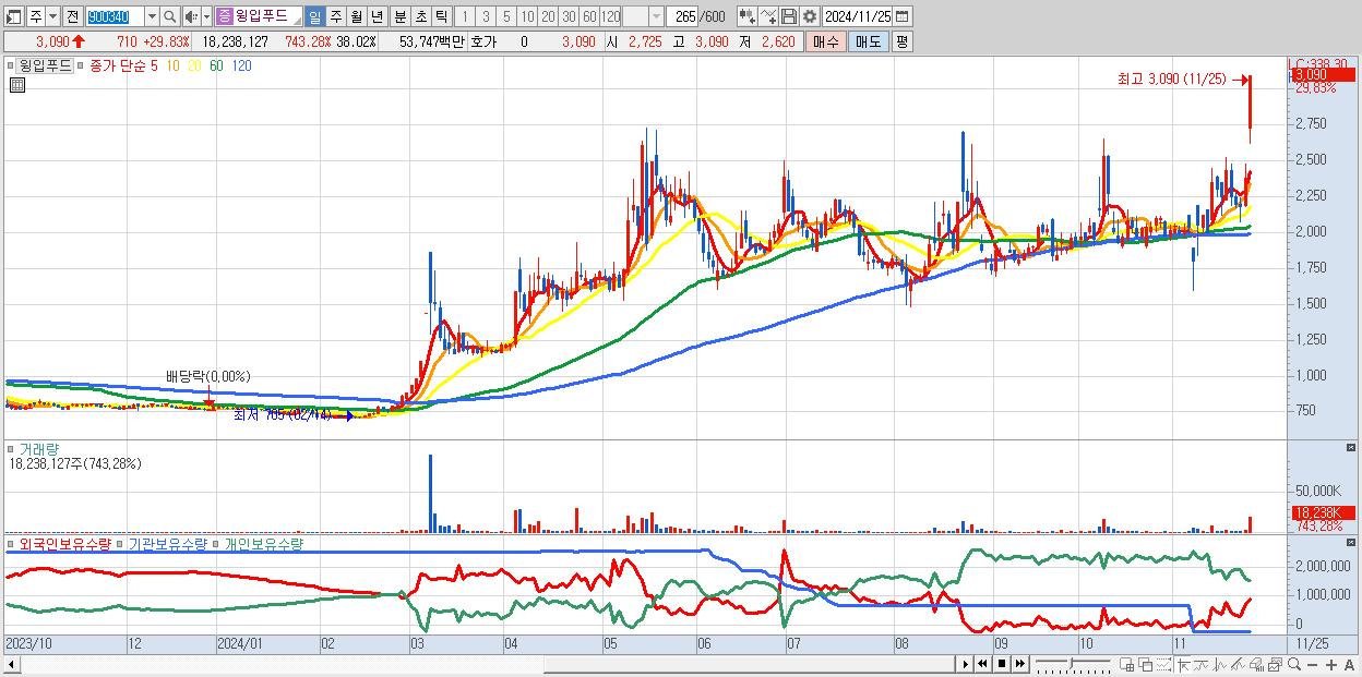 윙입푸드 3,090원 ▲ 29.83% (KOSDAQ, 900340)