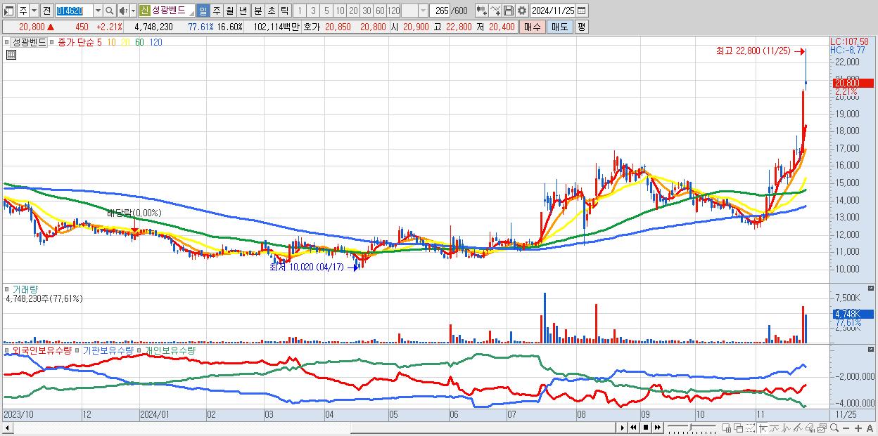 - 성광벤드 (20,800원 ▲ 2.21% , 시총: 5,949억, 거래량: 4,748,230, 거래대금:1,021억, KOSDAQ)