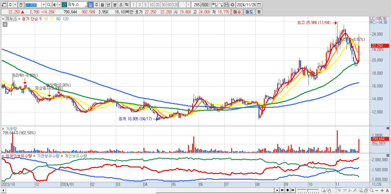 - 지누스 (22,250원 ▲ 14.28% , 시총: 4,508억, 거래량: 799,644, 거래대금:181억)