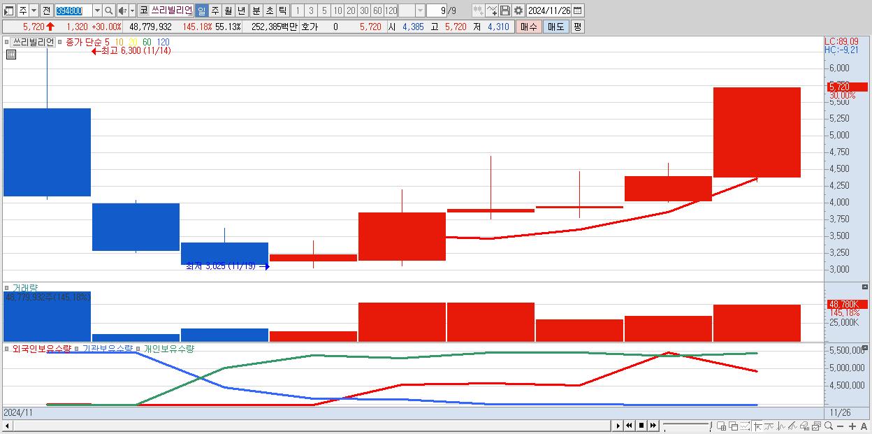 - 쓰리빌리언 (5,720원 ▲ 30% , 시총: 1,799억, 거래량: 48,779,932, 거래대금:2,524억)