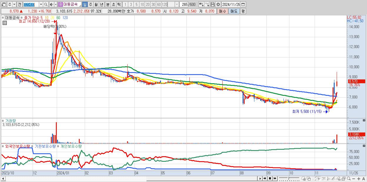 - 대동금속 (8,570원 ▲ 16.76% , 시총: 273억, 거래량: 3,103,615, 거래대금:281억)