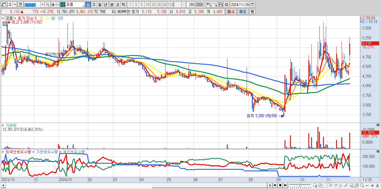 - 코콤 (5,110원 ▲ 16.27% , 시총: 896억, 거래량: 12,761,071, 거래대금:640억)