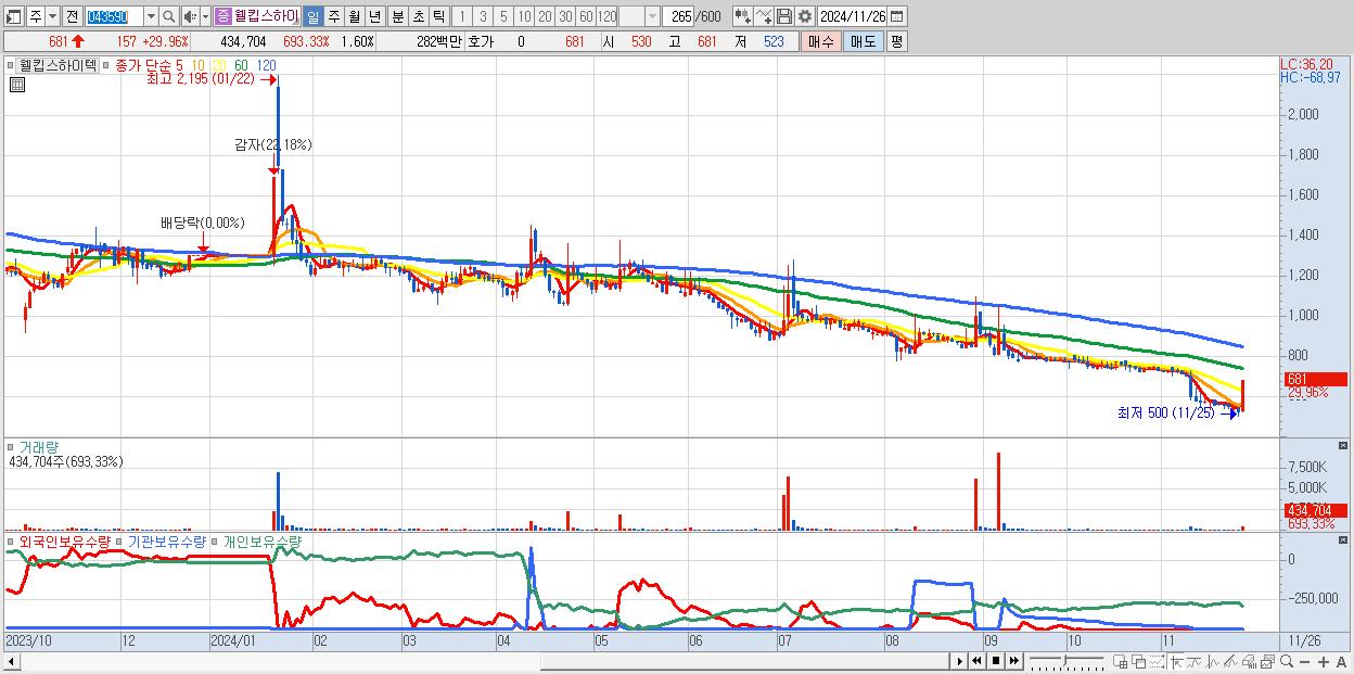 - 웰킵스하이텍 (681원 ▲ 29.96% , 시총: 185억, 거래량: 434,704, 거래대금:3억)