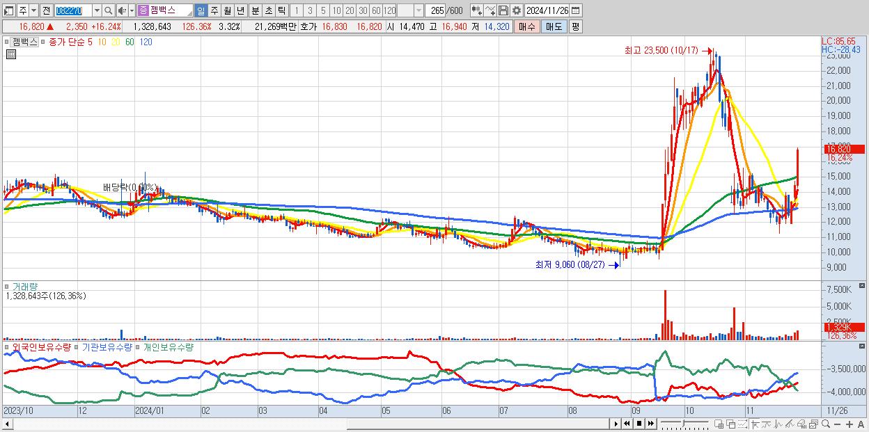 - 젬백스 (16,820원 ▲ 16.24% , 시총: 6,727억, 거래량: 1,328,643, 거래대금:213억)