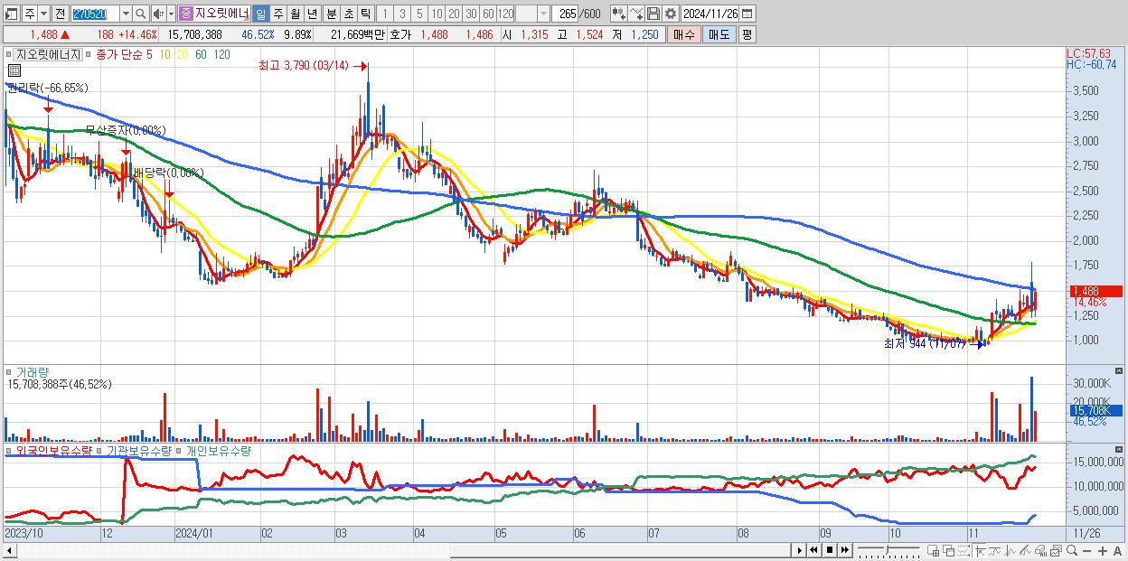 - 지오릿에너지 (1,488원 ▲ 14.46% , 시총: 2,363억, 거래량: 15,708,388, 거래대금:217억)