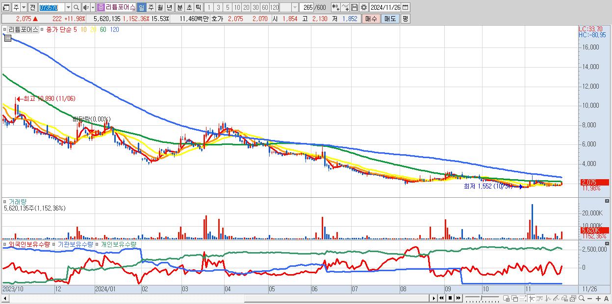 - 리튬포어스 (2,075원 ▲ 11.98% , 시총: 751억, 거래량: 5,620,135, 거래대금:115억)