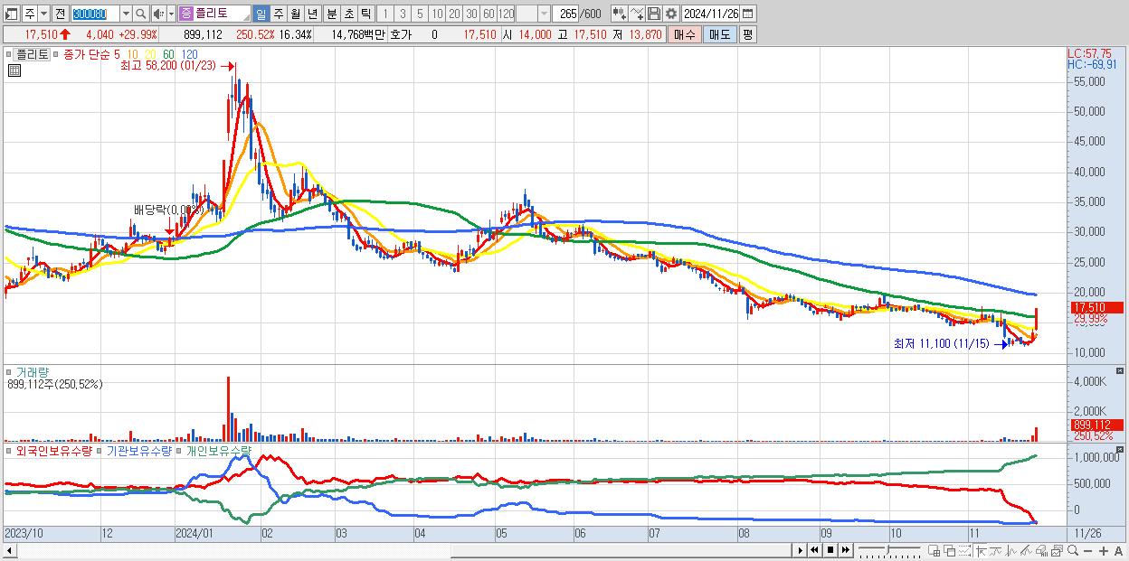 - 플리토 (17,510원 ▲ 29.99% , 시총: 963억, 거래량: 899,112, 거래대금:148억)