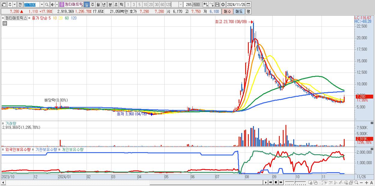 - 퀀타매트릭스 (7,280원 ▲ 17.99% , 시총: 1,204억, 거래량: 2,919,369, 거래대금:211억)