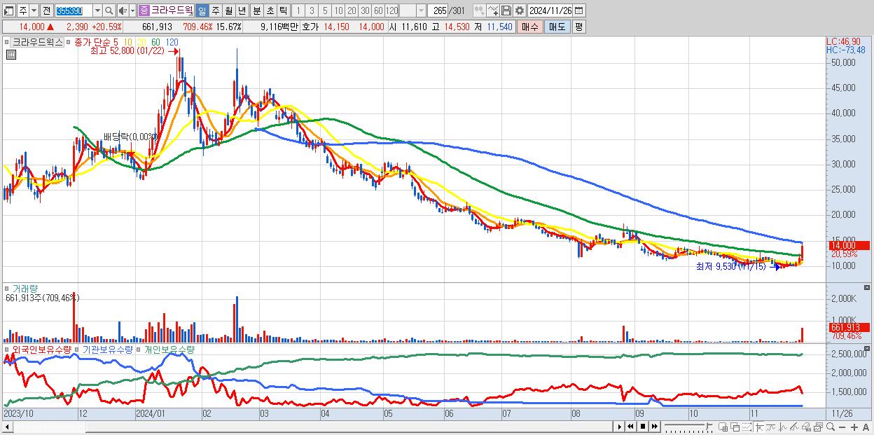 - 크라우드웍스 (14,000원 ▲ 20.59% , 시총: 591억, 거래량: 661,913, 거래대금:91억)