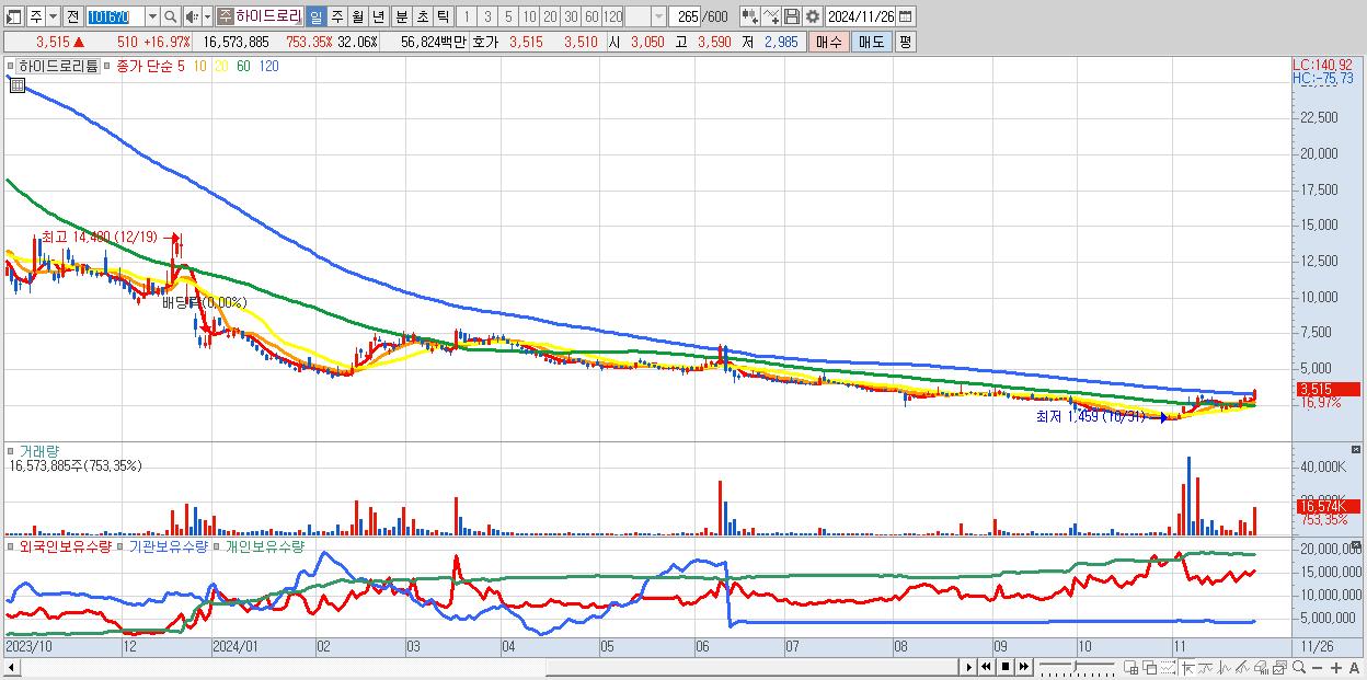- 하이드로리튬 (3,515원 ▲ 16.97% , 시총: 1,817억, 거래량: 16,573,885, 거래대금:568억)