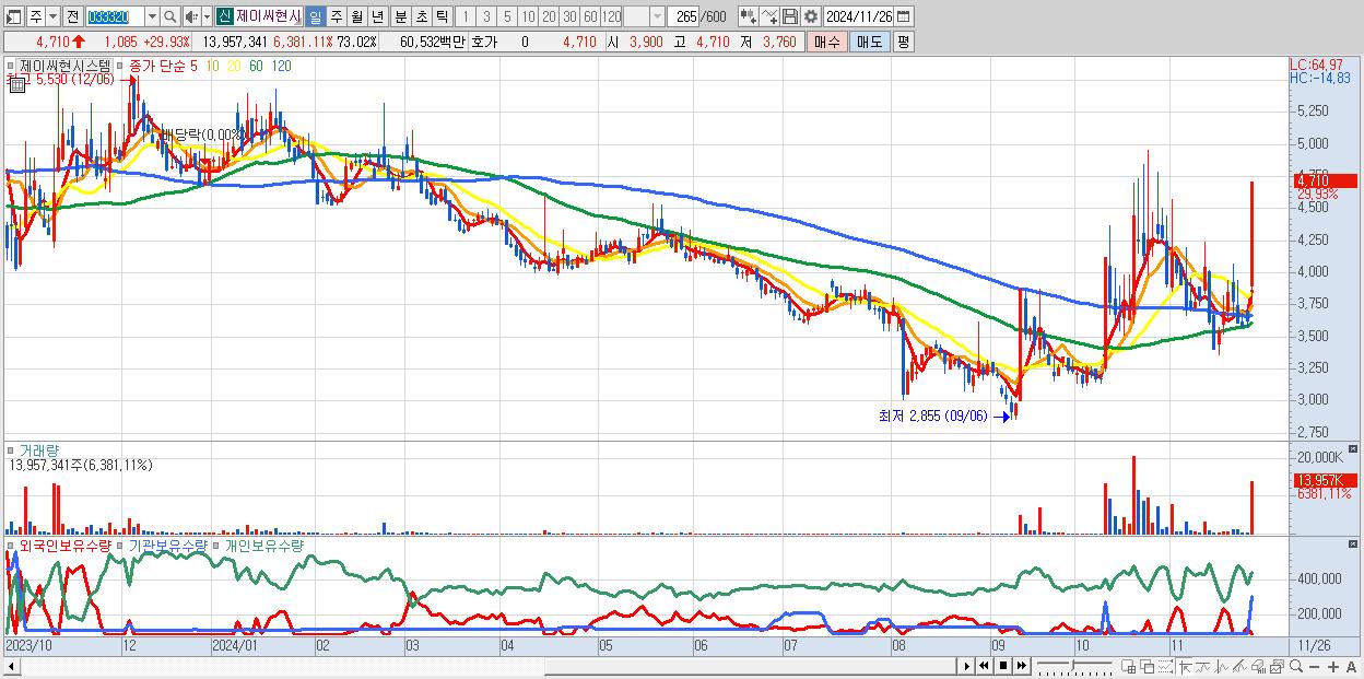 - 제이씨현시스템 (4,710원 ▲ 29.93% , 시총: 900억, 거래량: 13,957,341, 거래대금:605억)