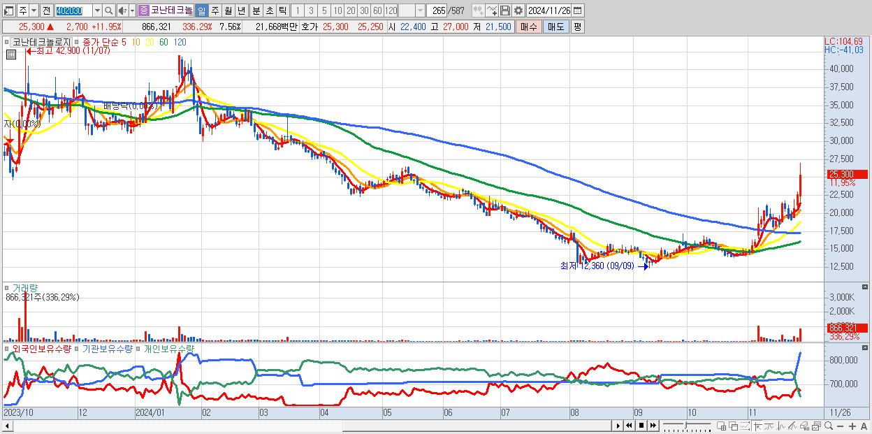 - 코난테크놀로지 (25,300원 ▲ 11.95% , 시총: 2,898억, 거래량: 866,321, 거래대금:217억)