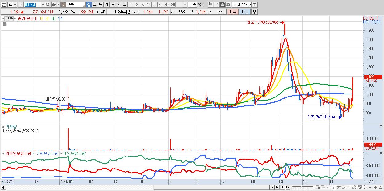 - 신풍 (1,189원 ▲ 24.11% , 시총: 416억, 거래량: 1,658,757, 거래대금:18억)