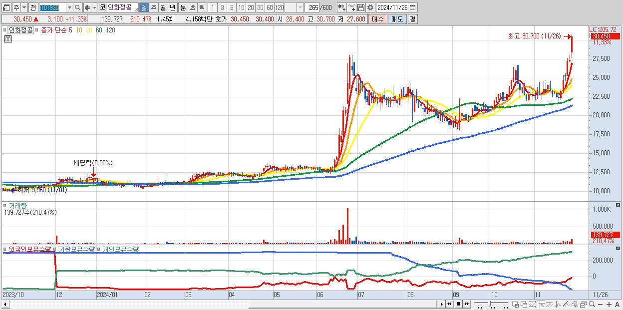 - 인화정공 (30,450원 ▲ 11.33% , 시총: 2,928억, 거래량: 139,727, 거래대금:42억)